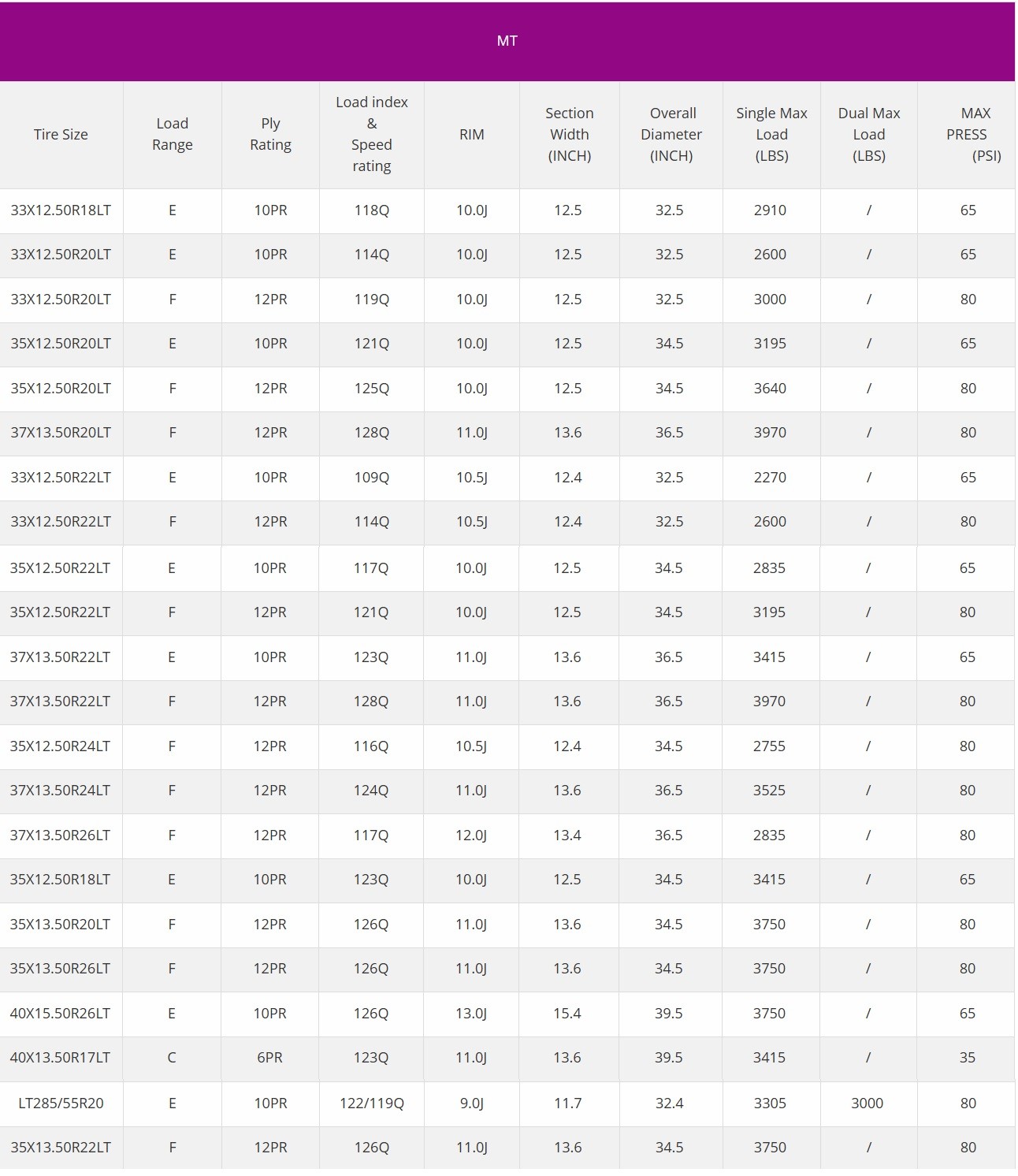 | TIRE SIZE: | 37X13.5R26LT |